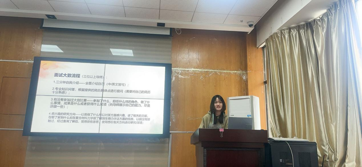 随后分享的是保研至湖南大学、曾获得力学竞赛省三等奖、国家励志奖学金、三好学生,优秀学生干部等荣誉的黄肖依。黄肖依首先提到的就是心态问题,保持良好的心态也是保研路上的一个重要条件。接着,黄肖依分析了成绩、竞赛与论文的受重视程度与难易程度,为大家提供了明确的努力方向。最后黄肖依详细解释了保研面试的具体流程让大家对保研后续流程有了更深的了解。