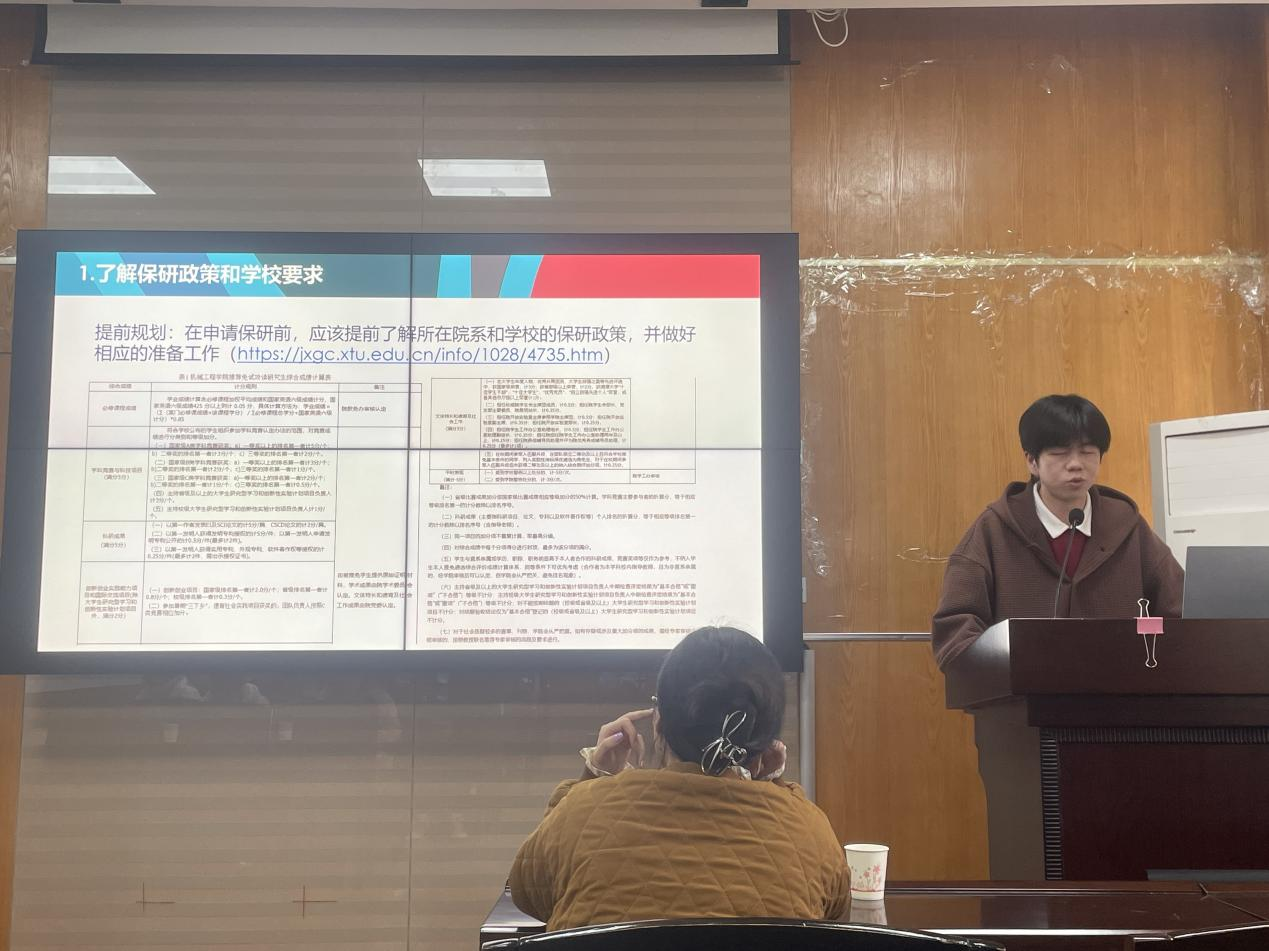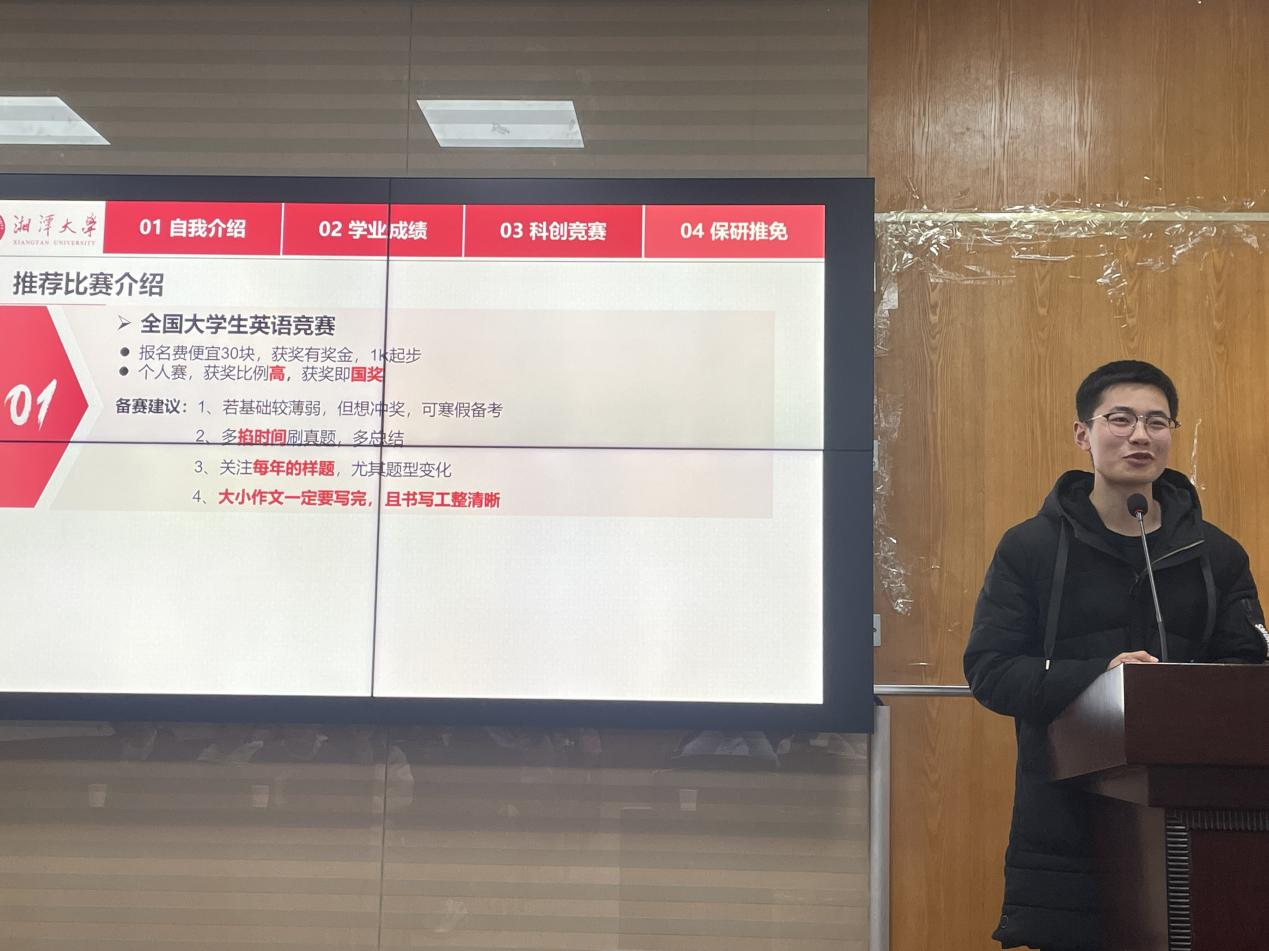 第一位分享的是综合测评专业第一、保研至华南理工大学、曾获英语竞赛、数学竞赛、数学建模竞赛等诸多奖项的曾绍荣。曾绍荣在成绩优异的同时在各类竞赛上有所成就。他分享道:“成绩是基石,竞赛只是锦上添花”。曾绍荣不仅为参会同学分享了考研资讯通道、时间线、准备工作还分享了部分学校面试要求的小彩蛋。
