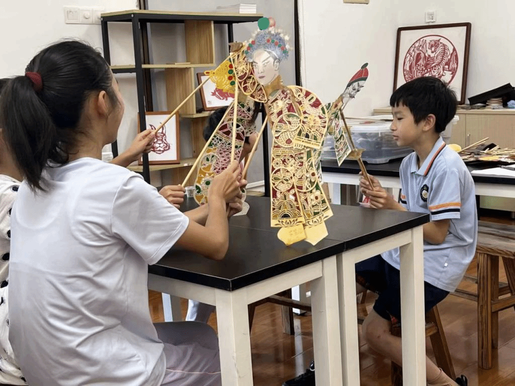 (图为小朋友们在传承人的指导下操作纸影戏影偶)