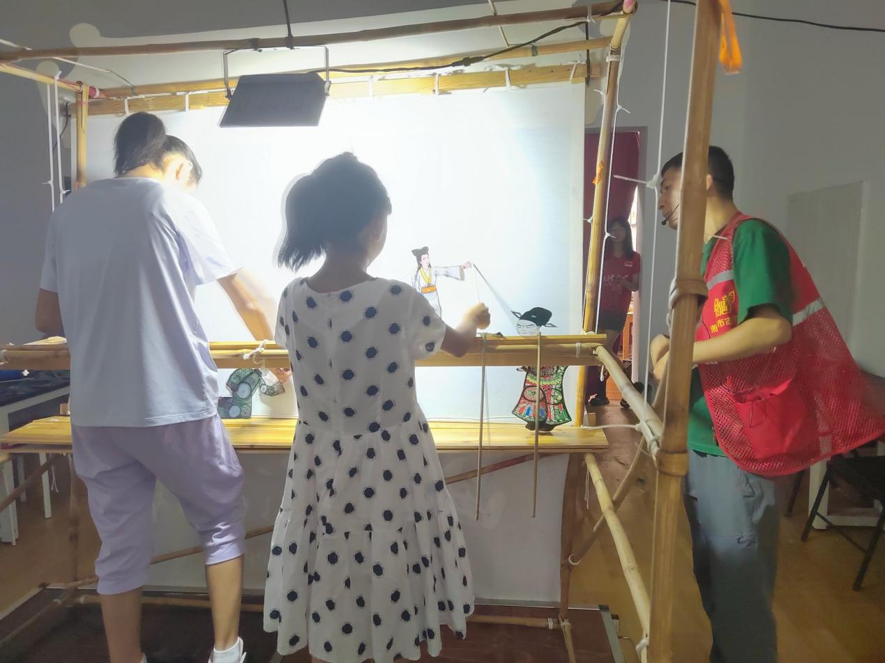 “三尺生绢做戏台,全凭十指逞诙谐”。在纸影戏偶制作完毕后,吴渊老师为小朋友们和实践团成员们生动地演示了如何通过对纸影戏偶的操纵和运用光影效果来塑造戏剧性场面,并鼓励小朋友们积极尝试,将自己的作品带入戏台中,通过操纵木棍控制纸影戏偶的动作。随后,白幕后亮起了光,一个个手掌大小的人物形象跃然幕上,抬腿、翻跟斗、转身,影偶在方幕后走过千山万水,穿越千秋万代,小朋友们在戏台上和古老历史相逢,同传统艺术共振。
