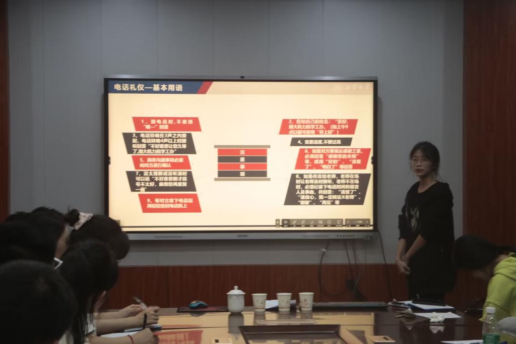 讲座第二部分,由学工助理为大家介绍工作生活中常用的礼仪,其中包括进出门礼仪、电话礼仪、会议礼仪等办公室礼仪以及引路礼仪、握手礼仪、餐桌礼仪等生活常用礼仪,培训过程中将各个礼仪细致化,形象化。学生通过观看视频,了解实例充分认识到礼仪在生活工作中的重要性,让基本礼仪走进学生的日常生活。