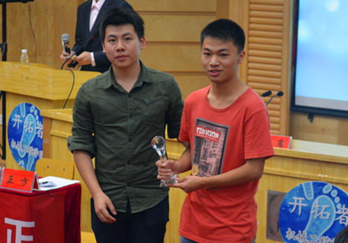表演赛正式开始,主席上台自我介绍并有请双方辩手入场。本次辩论赛主题是;神一样的对手更可怕(正方),猪一样的队友更可怕(反方)。正反方一辩首先交替开篇立论,阐述己方观点。随后,双方二、三辩分别对对方一、四辩进行质询,双方你来我往,语言诙谐幽默,现场气氛十分活跃,观众开怀大笑的同时也不忘鼓掌喝彩。紧接着的自由辩中双方唇枪舌战,不分上下,最后双方四辩总结陈词,本次表演赛也告一段落。