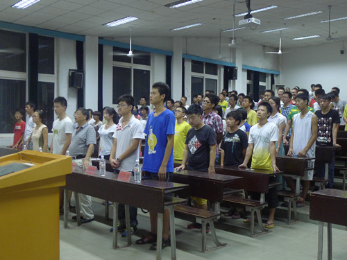 大会开始,全体起立,奏唱青年志愿者之歌。紧接着,由谭书记致开幕词;书记倡导大家积极乐观,热情大方的迎接新生,向13级新生传递机械正能量;随后由移动赞助商代表上台讲话;紧接着,主持人强调了新生接待的注意的事项;最后,进行全体志愿者宣誓仪式。