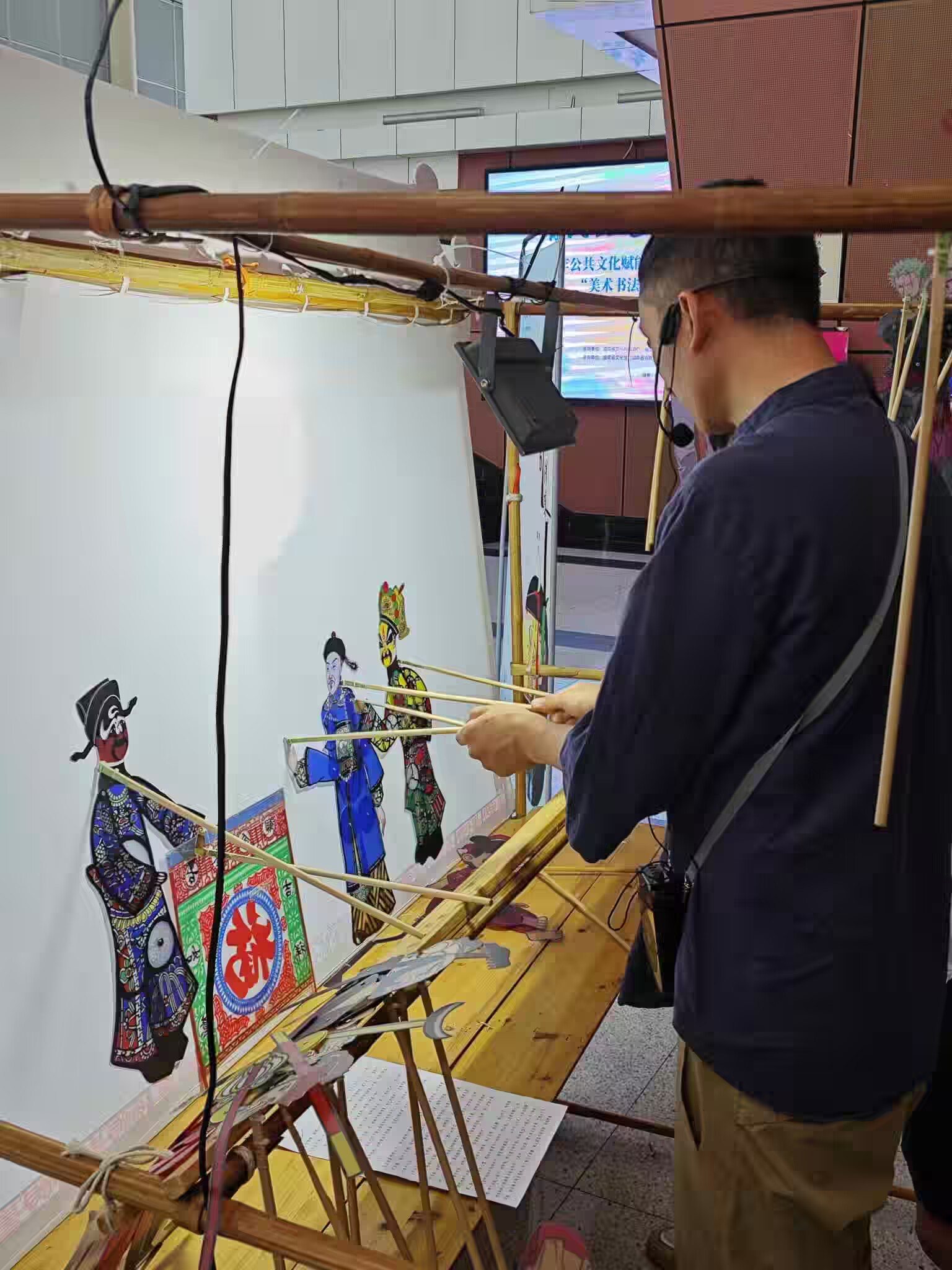 而活动中的一大亮点,当属湖南省省级非遗传承人吴渊老师及其团队带来的传统非遗纸影表演。在活动正式开始前,吴渊老师精心准备的互动环节便吸引了众人的目光。他拿出自己制作的与当代影视角色相关的纸影,与现场的大人小孩进行亲切互动。这些贴近生活的角色,瞬间点燃了大家的兴趣,尤其是孩子们,纷纷被这些栩栩如生的纸影所吸引。吴渊老师热情地鼓励孩子们挑选自己喜欢的角色,来到幕布后面亲身体验,亲手操作纸影。孩子们稚嫩的小手在幕布后轻轻摆动,一个个纸影角色仿佛被赋予了生命,在光影交错间舞动。通过这样的互动,不仅让孩子们感受到了动手的乐趣,更让更多人直观地了解到湘潭非遗纸影的文化魅力,在孩子们心中播下了非遗传承的种子。