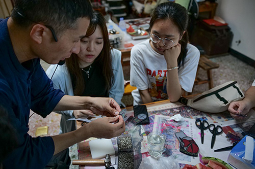 (图为吴渊老师指导团队成员进行纸影艺术创作)