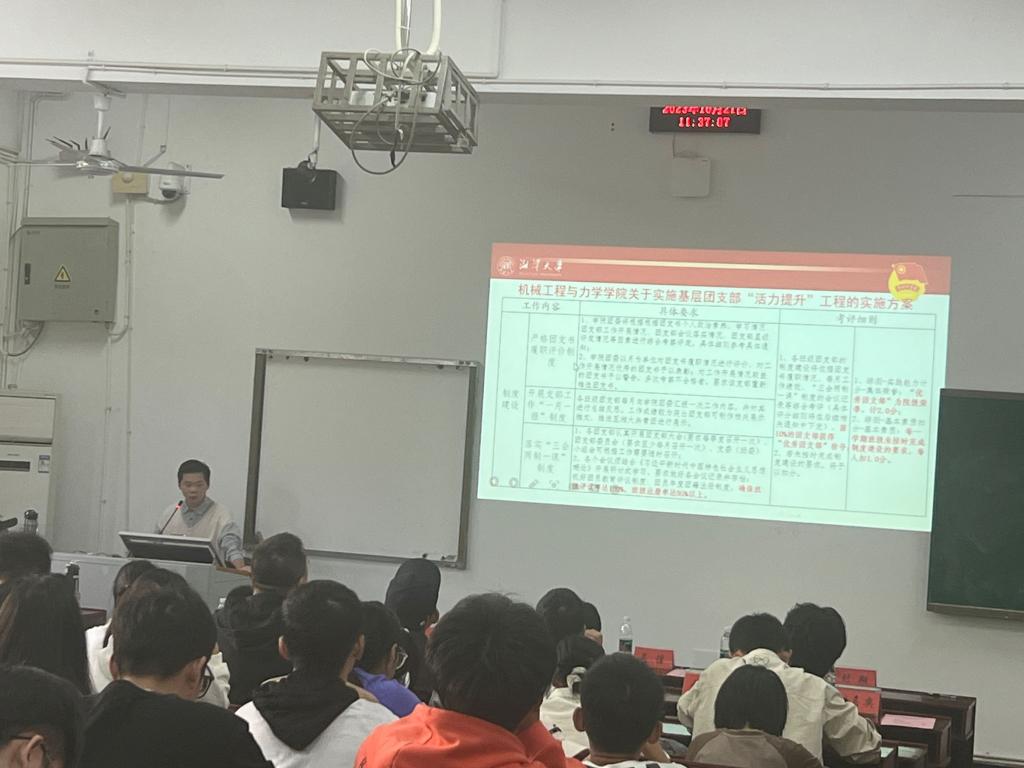 冀志宏老师给大家进行了基层团支部“活力提升”工程团支部书记培训大会。提出以完善团支部组织建设、围绕主题活动和团员意识教育、创新团支部活动形式提升团员的参与活力,坚持创先争优和坚持特色激励的工作导向,来不断提升组织运行、工作开展活力,促进团支部组织运行更加规范、顺畅,增强共青团组织的吸引力、凝聚力、战斗力。同时,也给出各项具体的实施方案。
