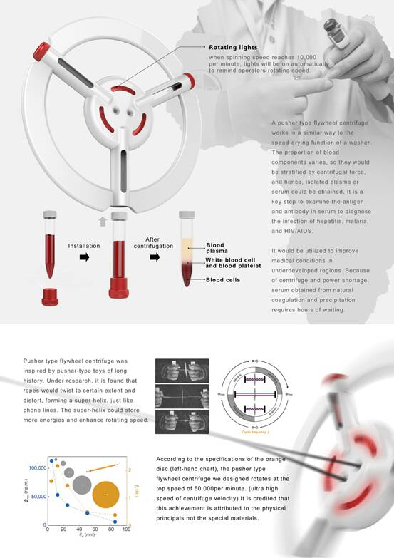 “Flywheel Centrifuge(拉线飞轮离心机)”的灵感来自于历史悠久的拉线玩具,设计团队研究发现,这种简易玩具的旋转速度可以达到每分钟50,000转,能够符合血浆离心转速需求,经过设计的拉线飞轮离心机能在 1.5 分钟内从血液中分离出血浆,比传统离心机快 25%,仅5元人民币成本,并且不需要电力,对于经济欠缺的发展中国家(如非洲等国)降低医疗成本,具有积极意义。