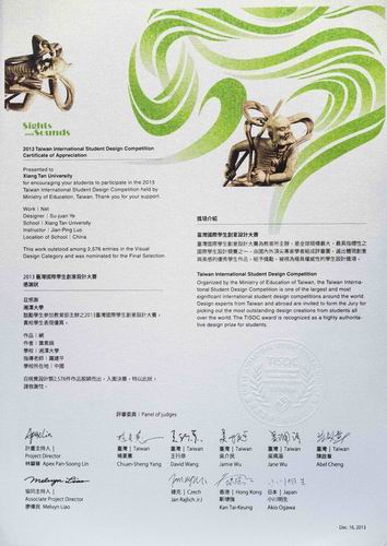 机械工程学院工业设计系学生叶素娟(指导老师:罗建平)的视觉传达设计作品“网”,参加台湾举办的国际性学生比赛“2013台湾国际学生创意设计大赛”,从视觉设计类2576件作品中脱颖而出,获得优秀设计奖,该设计作品收录于竞赛专刊。