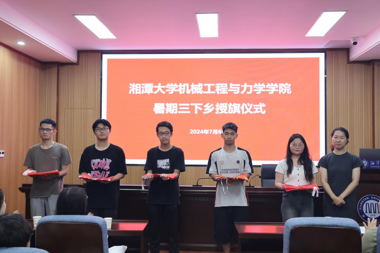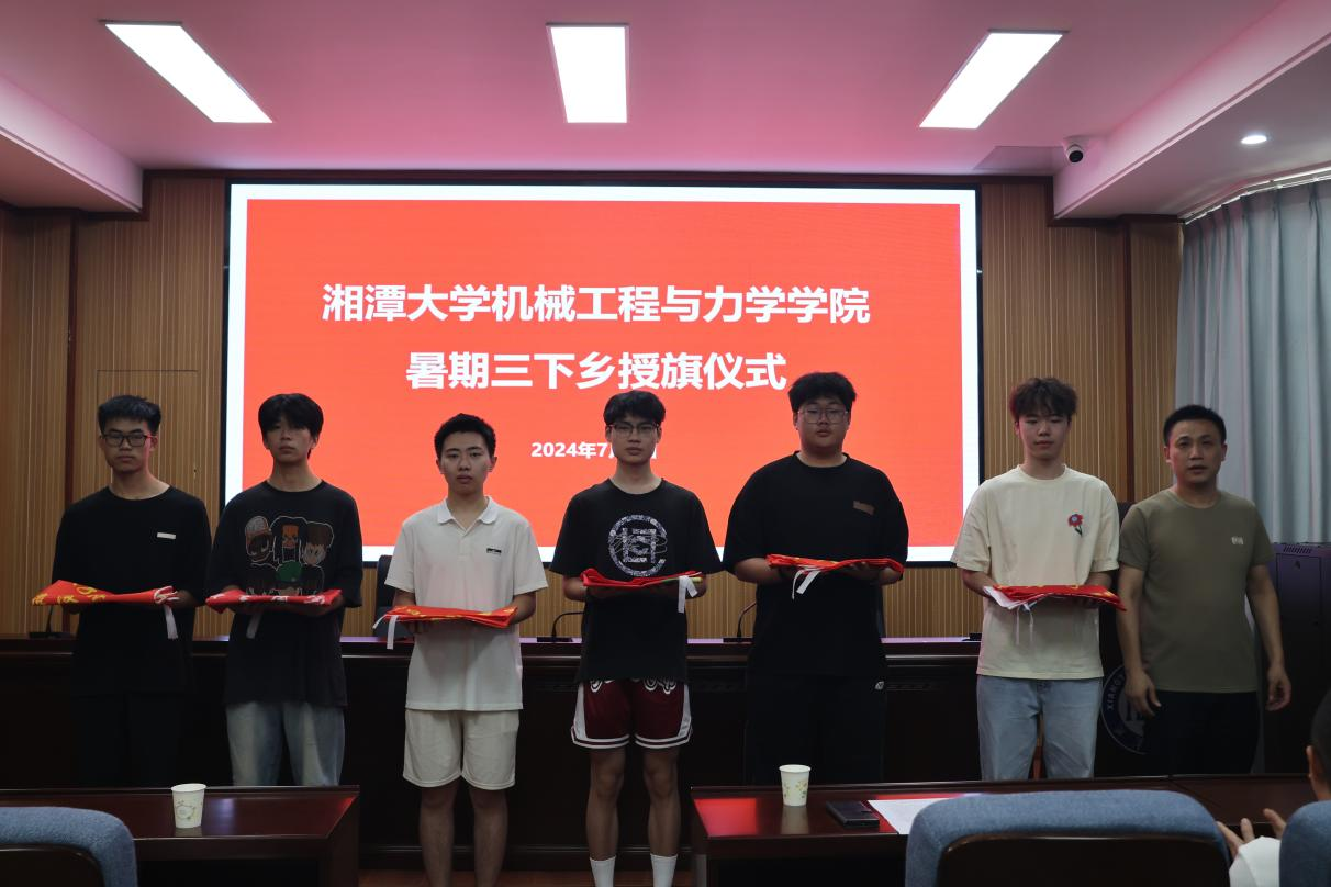 会议最后,邓建勇书记、蔡嘉敏老师为十二支“三下乡”暑期实践团(代表团)授旗,2024年大学生暑期“三下乡”社会实践活动正式启动。
