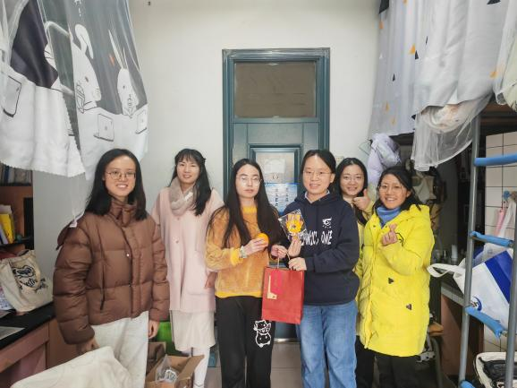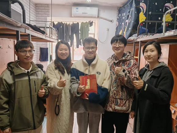 老师们走访考研学生寝室,耐心询问备考情况,细心叮嘱注意事项,并送上了"考研加油包"。里面不仅有实用的"好事发生"文具、"保你上岸"暖宝宝、"运气旺旺"的旺仔生唐、"心想事成"橙子、"一举夺魁"向日葵等,还有写满鼓励与祝福的贺卡,每一份礼物都承载着学院对考研学生的美好祝愿。