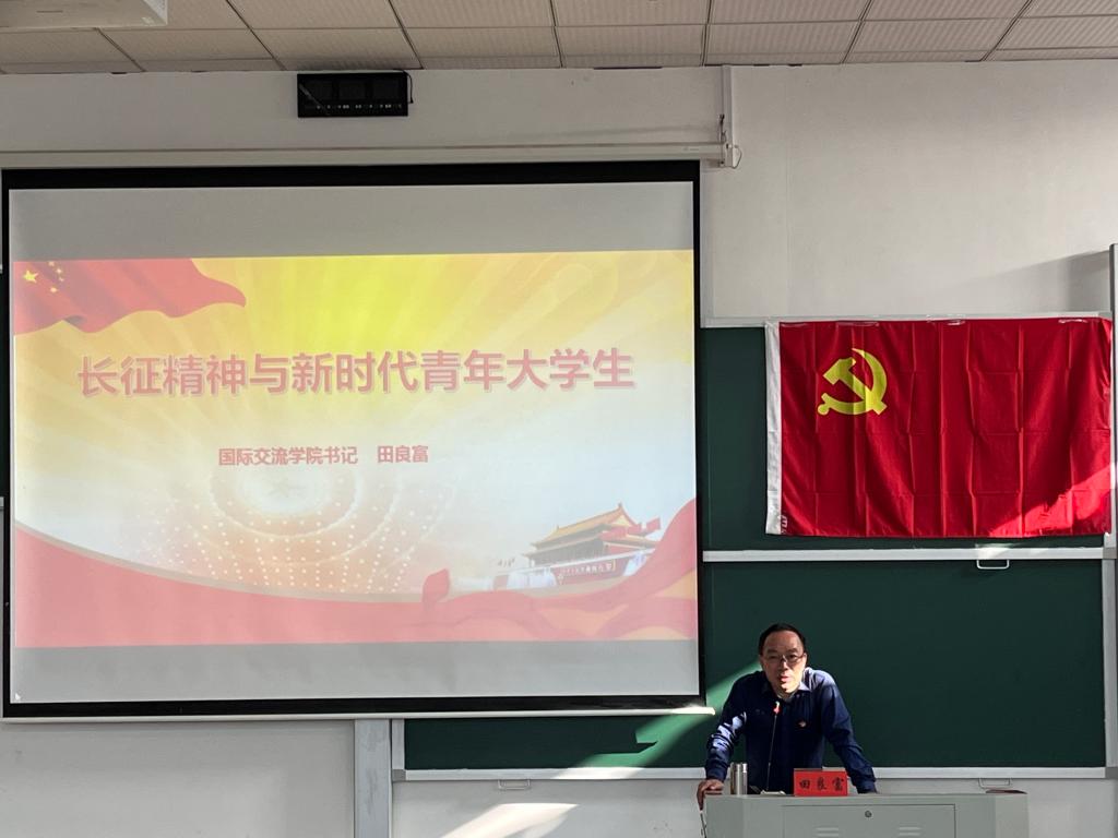 国际交流学院党支部书记田良富以“长征精神与新时代大学生”为题进行授课,他从长征历史的意义价值出发,讲述长征英雄的事迹,引导大家追寻长征足迹、感悟长征精神、坚定入党初心。