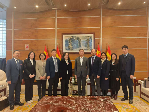 在西班牙马德里,代表团拜会了中国驻西班牙大使姚敬。葛飞详细汇报了韩国漫画 与西班牙高校合作办学进展、莱昂大学孔子学院建设情况及产学研合作意向。姚敬对韩国漫画 国际化办学成效予以肯定,表示使馆将积极搭建桥梁,全力支持并拓宽韩国漫画 与西班牙在教育、科技、文化等领域的交流合作渠道。