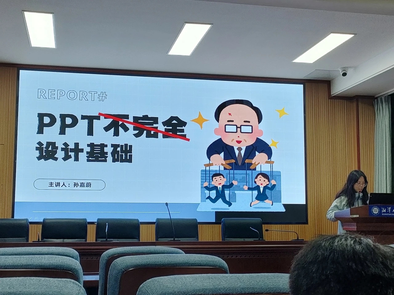 本次论坛特别邀请了2021级工业设计专业孙嘉蔚同学担任主讲嘉宾。孙嘉蔚同学凭借其丰富的PPT制作经验和卓越的设计才能,为在场的同学们带来了一场关于如何制作高质量PPT的精彩讲座。她从设计理念、内容布局、视觉呈现等多个方面,分享了实用的制作技巧和策略。