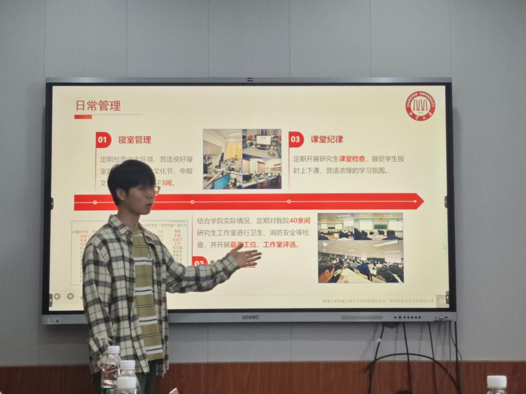 随后,湖南工程学院机械工程学院主席张淏瑜介绍了其学院研究生会的具体工作模式和组织架构,他围绕组织建设、思想引领、交流联动及学业就业等核心领域,分享了该组织在探索新模式、寻找新途径、运用新方法上的心得。同时,他还介绍了一系列活动项目,包括学术沙龙、体育赛事等,充分展现了其丰富多彩的研究生会生活。