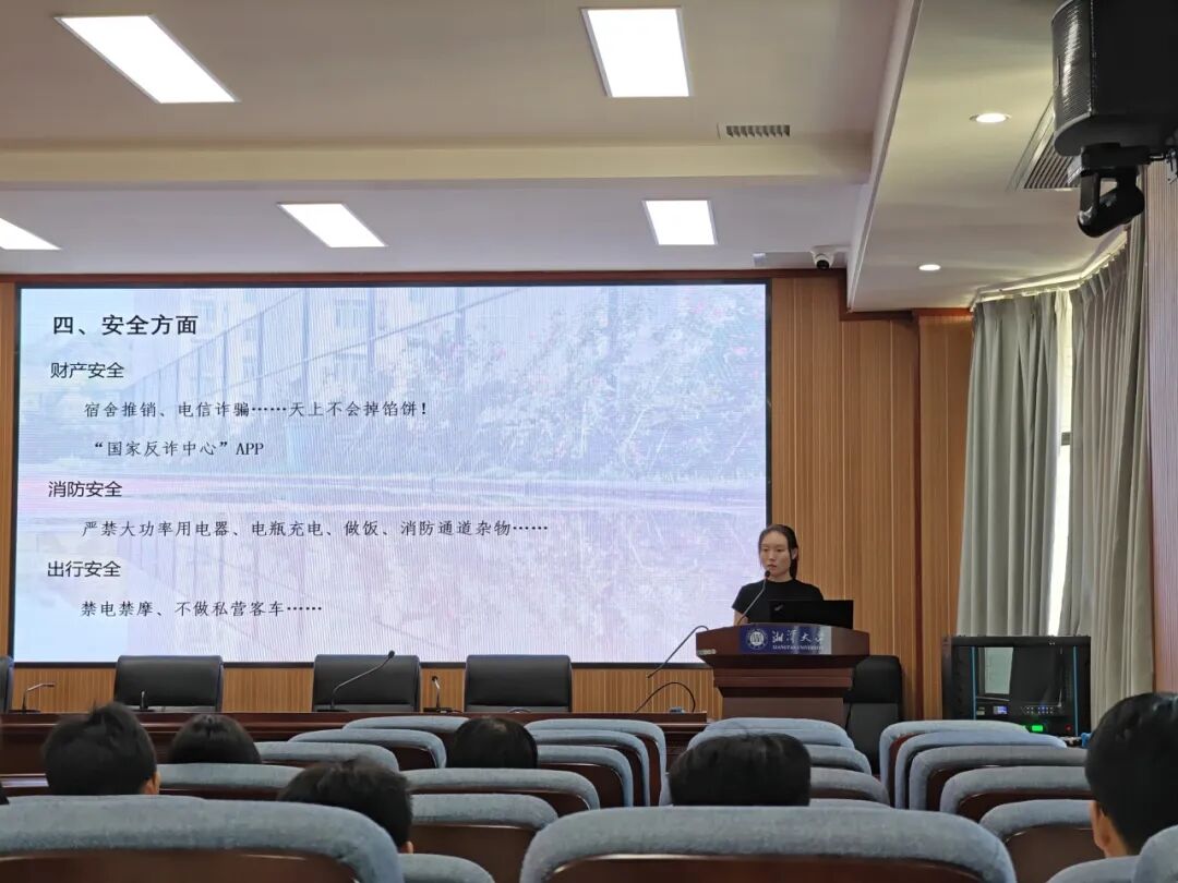 班会伊始,辅导员于慧美向新生介绍了研工办的基本情况、人员分工、办公地点及联系方式,帮助同学们熟悉学生工作管理体系。随后,她重点讲解了日常管理制度,包括请假流程、宿舍与工作室管理等规定,提醒同学们自觉遵守校纪校规。于老师还特别强调了心理健康的重要性,鼓励同学们关注情绪状态,并在需要时积极利用学校心理咨询中心资源。关于安全方面,她通过典型案例提醒大家注意财产安全、防范电信诈骗、重视消防安全和出行安全,增强自我保护意识。