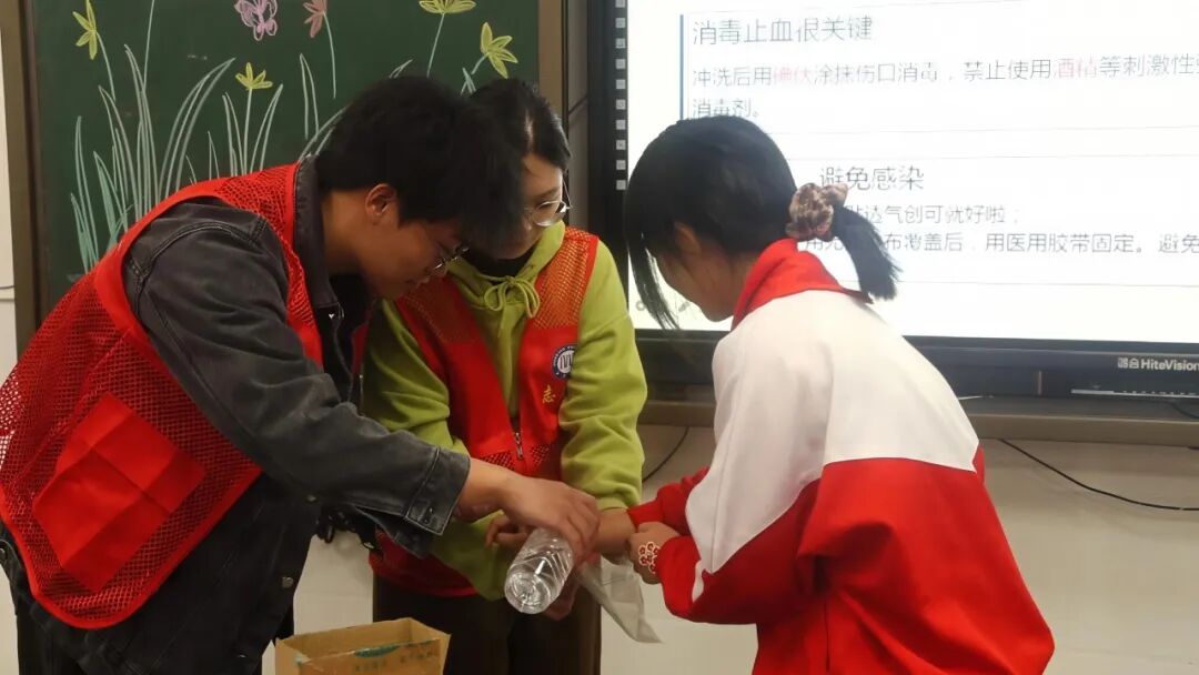 在安全教育环节,主讲人李嘉成则围绕防止校园欺凌与急救技能展开教学。通过“取外号是否属于霸凌”等问题引导学生思考,并讲解“不做受害者、不做欺凌者、不做旁观者”的基本原则。急救技能教学中,李嘉成利用模拟伤口道具,演示擦伤消毒、鼻血止血等常见校园伤害的处理方法,指导学生进行实际操作,帮助他们掌握基本急救流程。