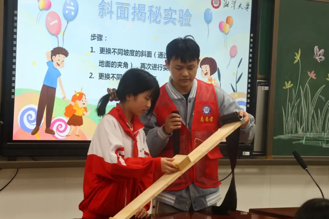 在机械科普部分,主讲人邱越以杠杆原理与斜面实验为核心内容,利用自制教具和实物模型,讲解机械省力的基本原理。学生分组参与“搭建杠杆”实验,通过动手操作理解支点位置与省力效果之间的关系。随后进行的“斜面揭秘实验”中,邱越邀请学生上台,通过调节斜面角度、放置不同重物,亲手体验斜面省力的原理及其在实际生活中的应用。